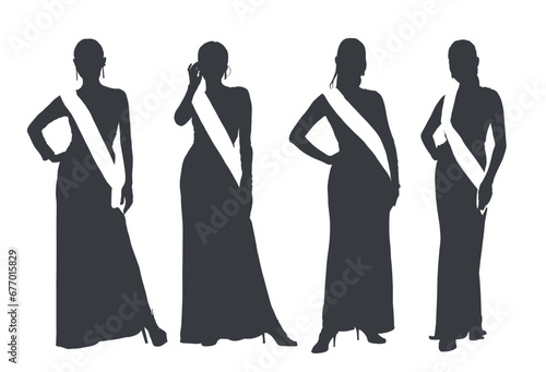 Gray silhouettes of pretty women group pose on white color background, flat line vector and illustration.