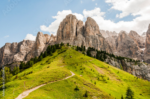 Grödner Joch, Sellagruppe, Sellastock, Sellamassiv, Dolomiten, Passhöhe, Wanderweg, Alpinismus, Südtirol, Trentino, Sommer, Italien