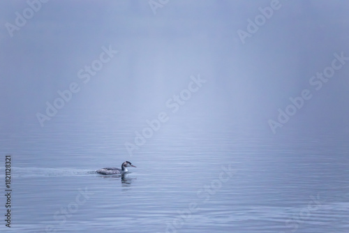 Great crested grebe (Podiceps cristatus) in winter plumage swimming on a misty lake.