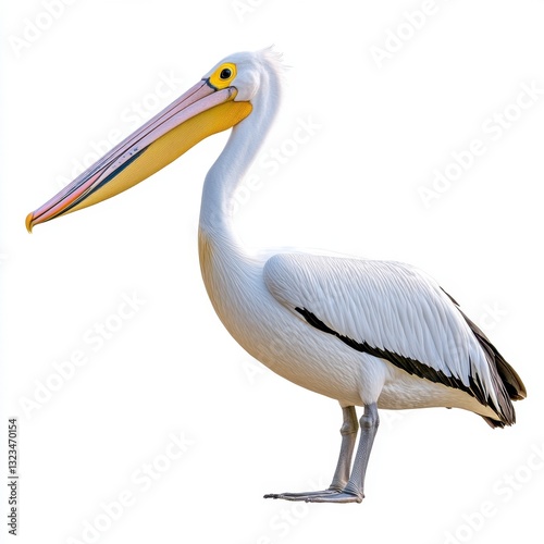 Great white pelican standing on white background, showcasing its large beak and plumage details.
