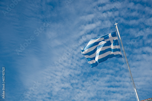 Greek blue and white flag waving against a blue dramatic cloudy sky.