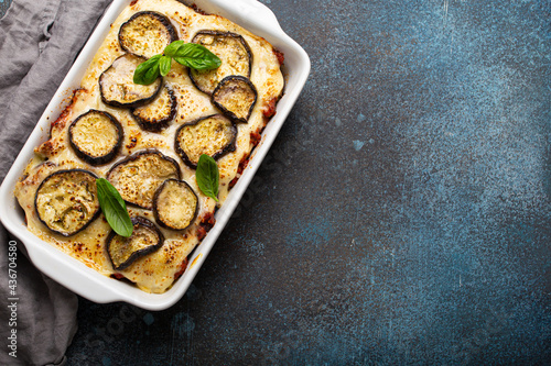 Greek mediterranean dish Moussaka with baked eggplants, ground beef in white ceramic casserole on rustic stone background from above, traditional dish of Greece, space for text