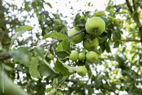 green apples hang on a branch