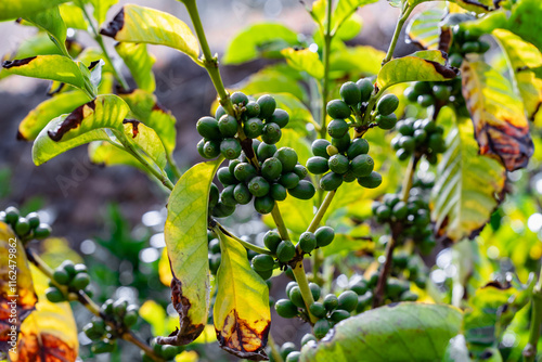 Green coffee beans on a coffee tree branch surrounded by lush foliage showcasing the early stage of coffee production before harvesting.