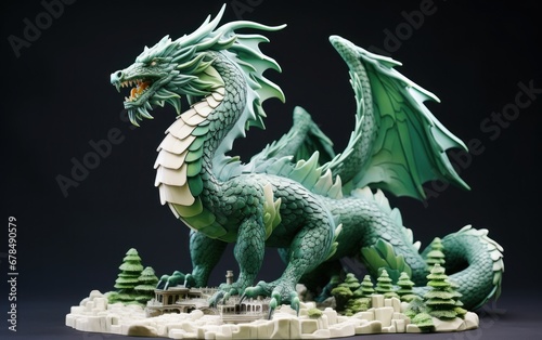 Green dragon toy on black background isolated, symbol of the year 2024, AI
