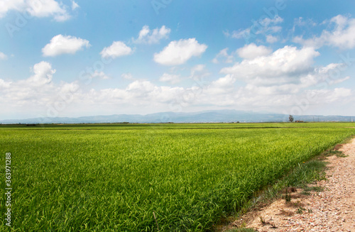 green fields of rice plantations in the Ebro River Delta in Catalonia