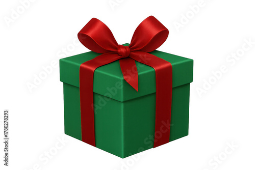 Green gift box with red ribbon and bow, symbolizing celebration, holidays, giving, presents, and surprise, isolated