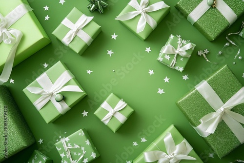 Green Gift Boxes with White Satin Ribbons, Scattered Stars, and Misty Green Gradient Background