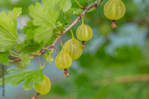 Green gooseberry berries on a green background on a summer day macro photography. Green berries hanging on a branch of a gooseberry bush close-up photo in summertime.