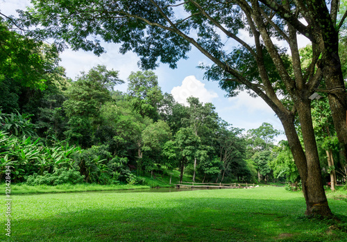green lawn landscape with tree shadow in park
