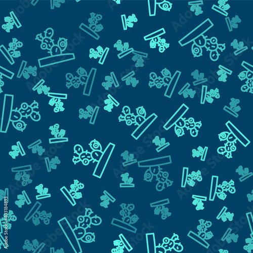Green line Cactus icon isolated seamless pattern on blue background. Vector.