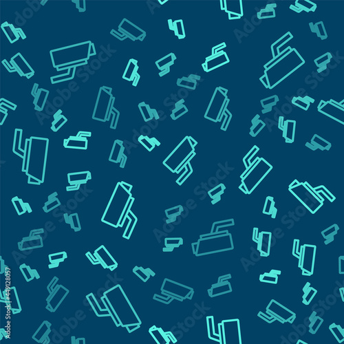 Green line Security camera icon isolated seamless pattern on blue background. Vector