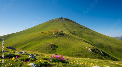 Green mountain under blue sky landscape scenery.