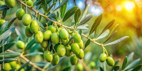 Green olives on an olive tree in a Mediterranean plantation, leaves