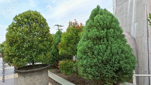 Green Outdoor Area with Well-Maintained Ornamental Trees in Pots for Garden Decoration, Suitable for Urban Public Parks and Home Landscaping Projects