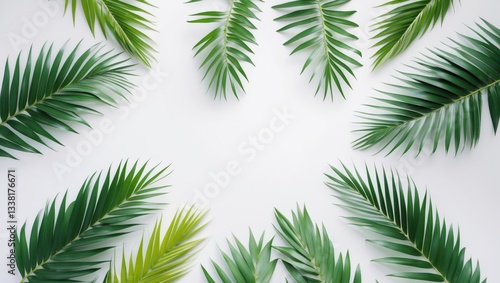 Green palm leaf branches on a white background. Flat lay composition, top view.
