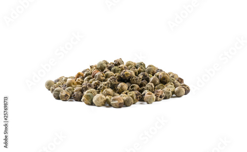 green pepper peppercorns heap isolated on white background. front view