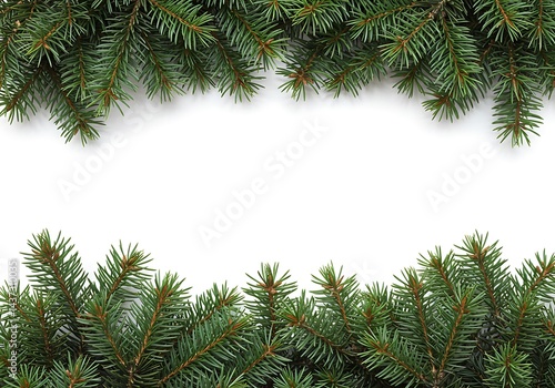 Green pine branches framing a white background creating a border at the top and bottom of the image