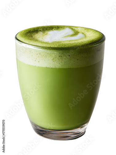 Green tea latte in a clear glass. Foamed milk atop, matcha green color