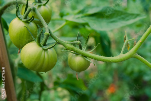 green tomatoes growing on the vine on defocused garden background