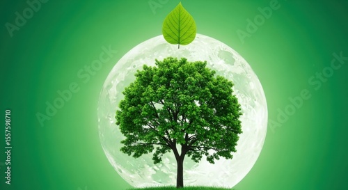Green Tree Growing Inside a Globe with a Leaf on Top Reflecting the Moon