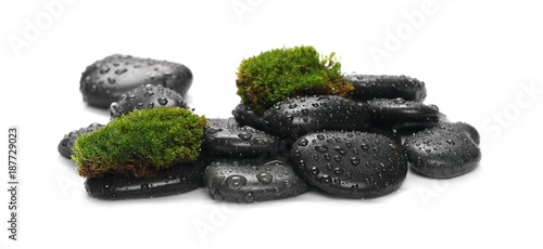 Green wet moss with black spa rocks and drops of water isolated on white background
