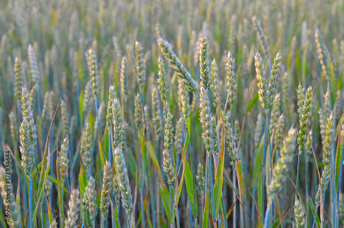 Green wheat field, growing plant, cultivated crop, agricultural background