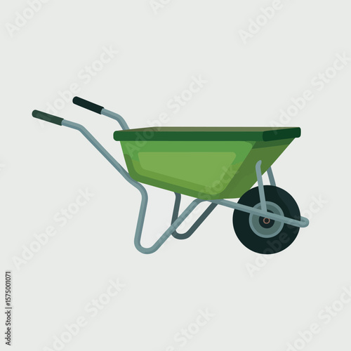 Green wheelbarrow with metal frame and handles on a light gray background