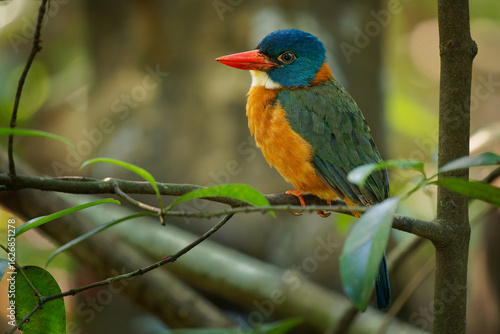 Green-backed kingfisher Actenoides monachus colourful bird in Alcedinidae endemic to Indonesia, can be found in the protected areas of Lore Lindu, Bogani Nani Wartabone, and Tangkoko Batuangus
