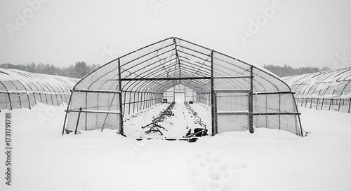 Greenhouse in Snowy Winter Landscape with Overcast Sky and Snow Cover