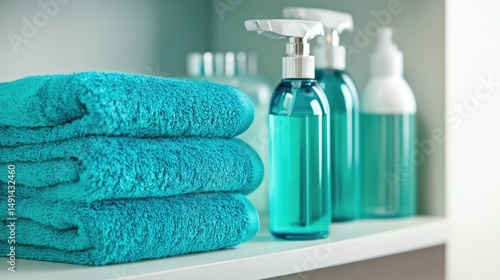 Green-labeled disinfectant spray bottle placed beside fresh towels on shelf