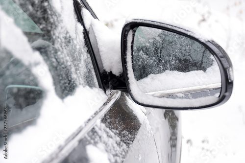 Grey car outside covered with snow and ice. Frozen window glass and car mirror with selective focus at the winter blizzard day.