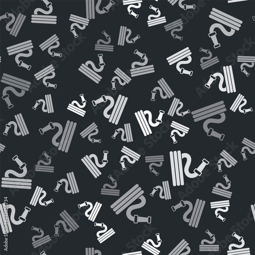 Grey Garden hose icon isolated seamless pattern on black background. Spray gun icon. Watering equipment. Vector