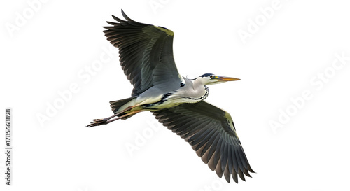 Grey Heron, in flight with wings spread wide showing detailed feathers and orange beak, cutout, PNG isolated on white or transparent background