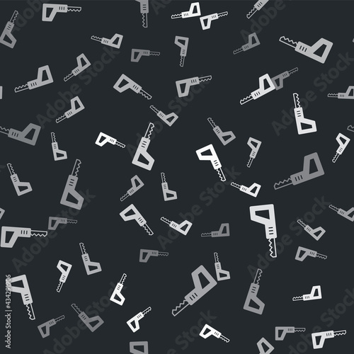 Grey Reciprocating saw and saw blade icon isolated seamless pattern on black background. Vector