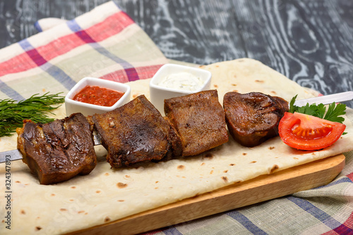 grilled beef kebabs with vegetables and sauces on lavas