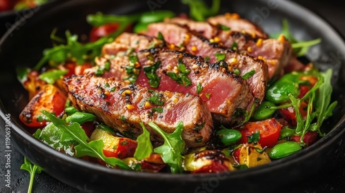 Grilled Beef Steak Slices on Fresh Vegetable Salad in Plate