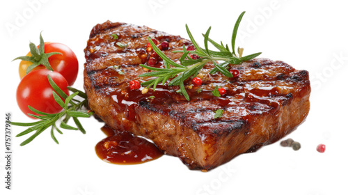 Grilled Beef Steak with Sauce Garnished with Fresh Herbs and Cherry Tomatoes on a White Background