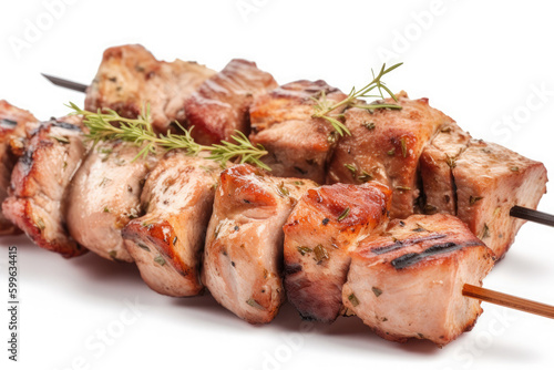 Grilled chicken meat skewer isolated on white background. Ai generative