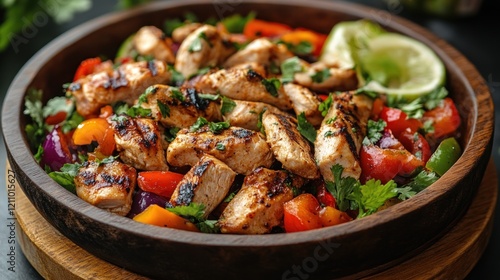 Grilled chicken served on a wooden platter with colorful vegetables and lime, showcasing a vibrant meal