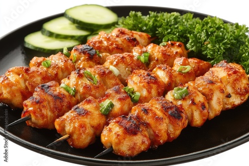 Grilled chicken skewers with garnish on black plate