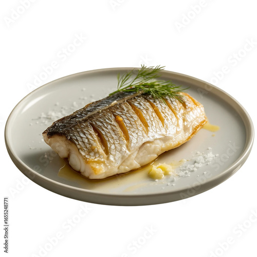 Grilled fish on a plate isolated on transparent background.