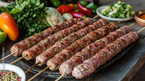 Grilled Kebabs with Fresh Vegetables and Herbs on Wooden Table, Delicious Barbecue Skewers Ready for Cooking, Culinary Delight for Food Lovers