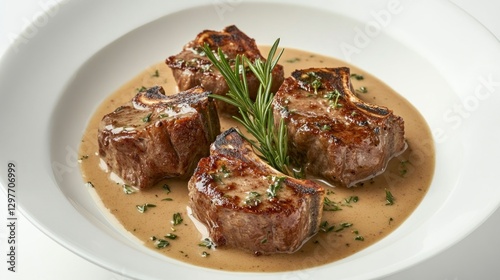 Grilled lamb chops served on a plate with sauce. Plain white background