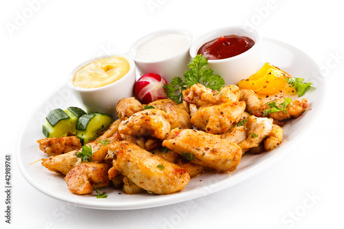Grilled meat and vegetables on white background