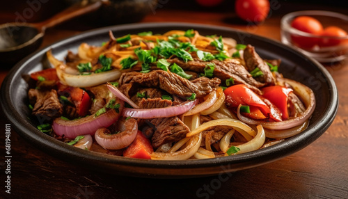 Grilled meat and vegetables on wooden plate, ready to eat generated by AI