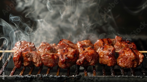Grilled meat kebabs on a skewer over an open flame. Succulent barbecue skewers with smoke rising. Mouthwatering charred meat on a grill with a smoky background for culinary promotions. AI