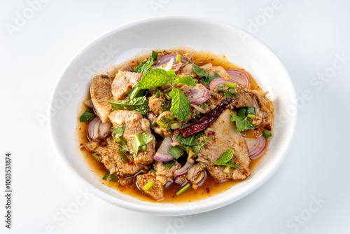 Grilled pork salad. on a white background Thai food. Isaan food.