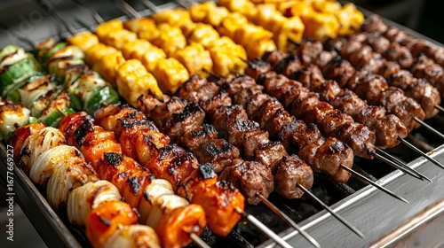 Grilled skewers of meat and vegetables served on a tray for Malatang