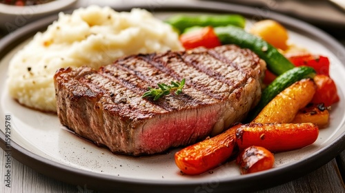 Grilled steak with mashed potatoes and roasted vegetables.
